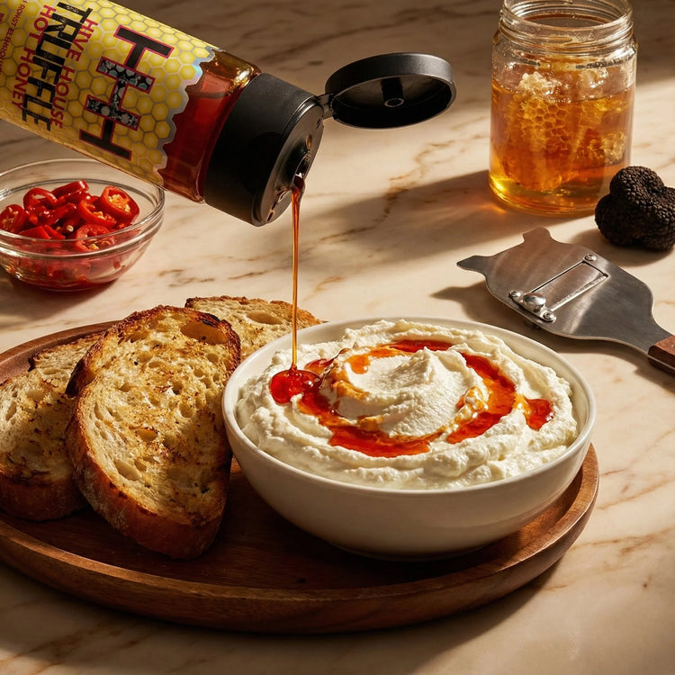 Ditch the syrup. We blendānever infuseāpure honey with crushed Calabrian chili peppers and a splash of vinegar for a hot honey with actual body and bold, balanced heat. Itās the perfect drizzle for pizza, fried chicken, and cheese boards. The "HUFFLE" our Truffle Hot Honey adds a earthly depth with every drizzle.